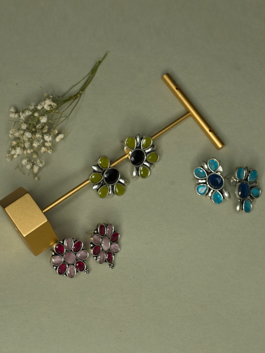 *Delicate oxidized studs with semi floral designs, featuring a bold stone throughout the design.