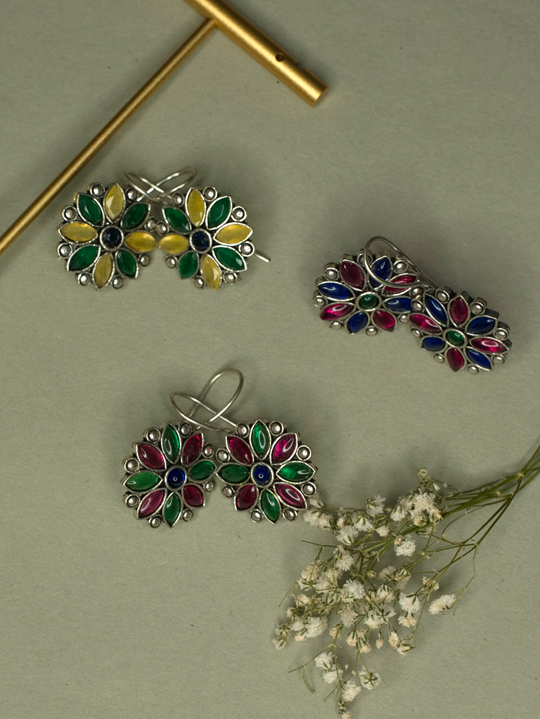 Delicate oxidized dangler with floral design, accented with multicolour stone.